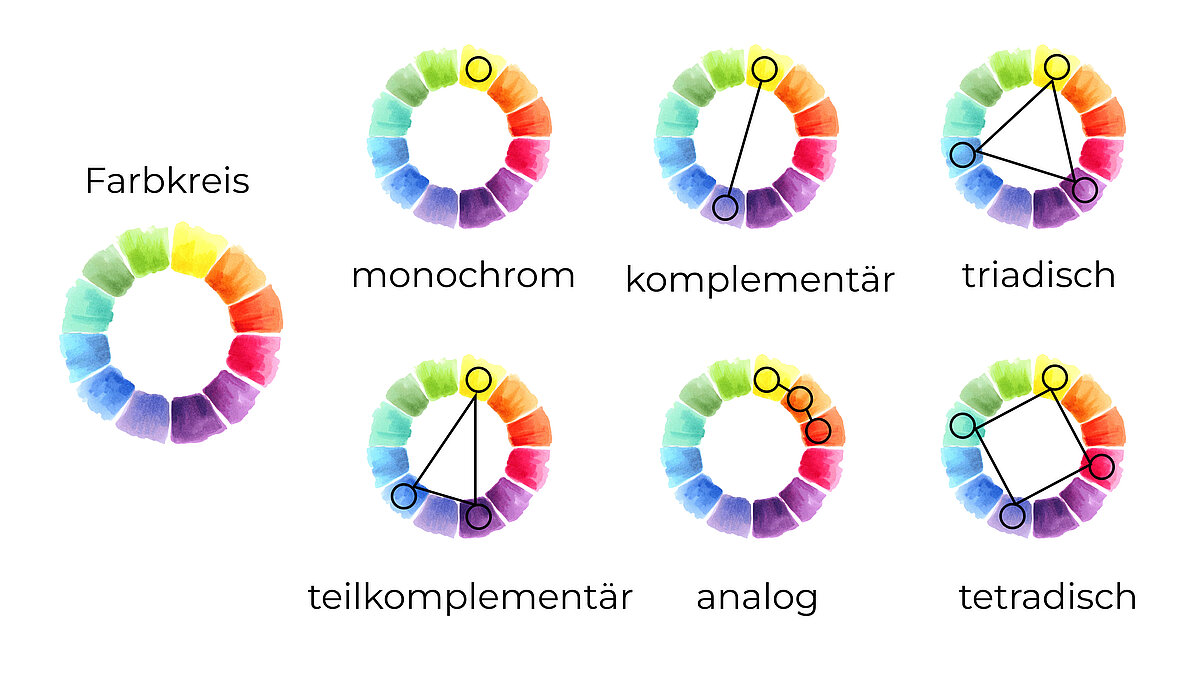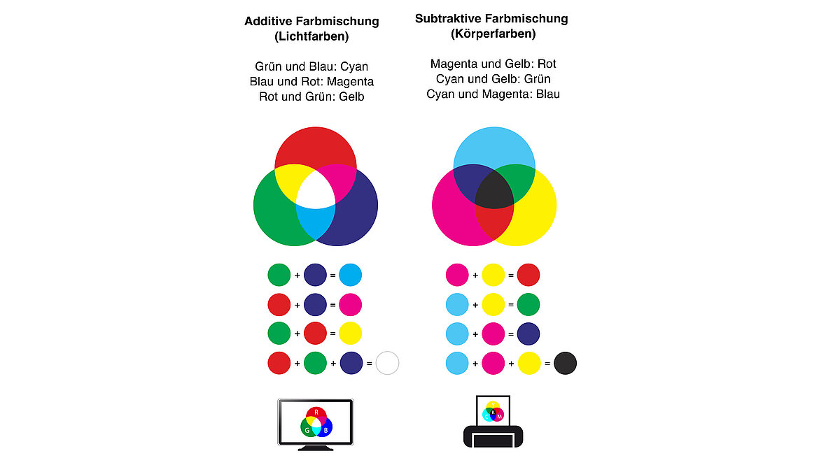 Wie mehrere Farben zusammen wirken, kann man gut erkennen - wenn man folgende Kombinationen kennt (siehe Bild):