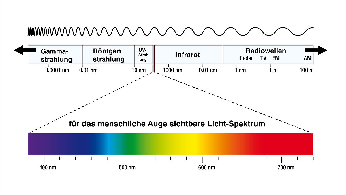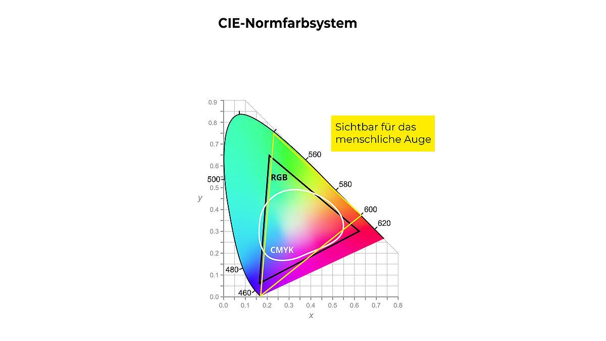 Das menschliche Auge kann nur Farben in dem Bereich von 400 nm bis 780 nm wahrnehmen. Das entspricht ungefähr 2,3 Millionen Farbtönen. Rote Töne sind länger wellig, Blau/ Violett ist kürzer wellig und Gelb/ Grün sind in der Mitte. Diese Farbeindrücke sind für jeden und jede von uns leicht verschieden. Auch auf Bildschirmen werden Farben oft unterschiedlich angezeigt. Um dies zu verhindert sollte immer der gleiche digitale Farbraum verwendet werden und die Farben der Bildschirme richtig kalibriert sein. Um Farbwerte genau anzugeben, gibt es verschiedene Varianten: Für eine Website ist die digitale Form - der RGB-Wert (Rot, Grün, Blau), oder der HEX-Code von größter Bedeutung.