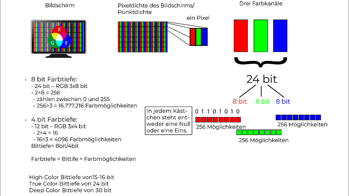 Ein Pixel besteht aus drei Farbkanälen (Rot, Grün und Blau). Jeder dieser Kanäle hat eine bestimmte Bittiefe (z.B. 8 bit – True Color), in denen die Farb-Daten gespeichert werden. Je mehr Speicher, umso mehr Abstufungen und desto mehr Farbmöglichkeiten.