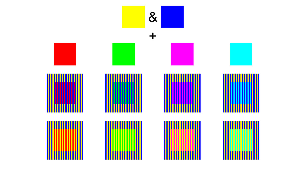 In der digitalen Welt gestaltet sich dies nun aber etwas anders. Bildschirme bestehen aus Pixeln, in denen nur drei verschiedene Farben vorkommen (Rot, Grün, Blau – RGB). Deshalb wird in einen gelben Bereich, auf dem Bildschirm, nur Rot und Grün im Pixel verwendet.