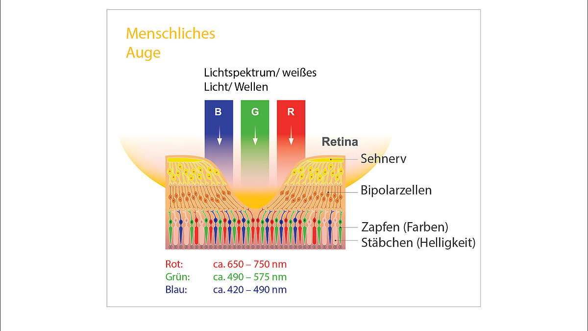 Jeder Mensch sieht Farben ein wenig anders, je nachdem wie empfindlich die Sehzellen auf die unterschiedlichen Wellenlängen des Lichtes reagieren. Um dies einmal zu testen ist folgender Link interessant: https://www.colorblindnesstest.org/farnsworth-munsell-100-hue-test/ . Auf unserer Retina/Netzhaut sitzen Stäbchen, die für die Helligkeit und Zapfen für die Farben verantwortlich sind. Es gibt drei Arten an Zapfen, die Rot-/Grün- & Blau-Rezeptoren, was uns Menschen zu sogenannten Trichromaten macht. Das weiße Licht beinhaltet alle Farben, trifft dies nun auf eine farbige Oberfläche, werden alle anderen Farben aus dem weißen Licht absorbiert und nur die Farbe reflektiert, die du letzendlich sehen kannst. Diese jeweilige Wellenlänge der Farbe, wird aus einer Kombination von Zapfen absorbiert. (z.B. Gelbes Licht wird von Rot- und Gün-Rezeptoren absorbiert und die Information „Gelb“ an das Gehirn weitergeleitet.)