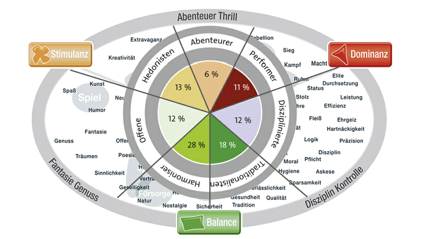 Anhand der folgenden Abbildung kann man gut erkennen, dass sich neben den typischen Eigenschaften dieser Persönlichkeitsprofile noch viel mehr ablesen lässt: Welche Werte sind für meine Zielgruppe wichtig und somit auch – auf welche Reize in Form von Wörtern, Bildern und Farben reagiert sie?