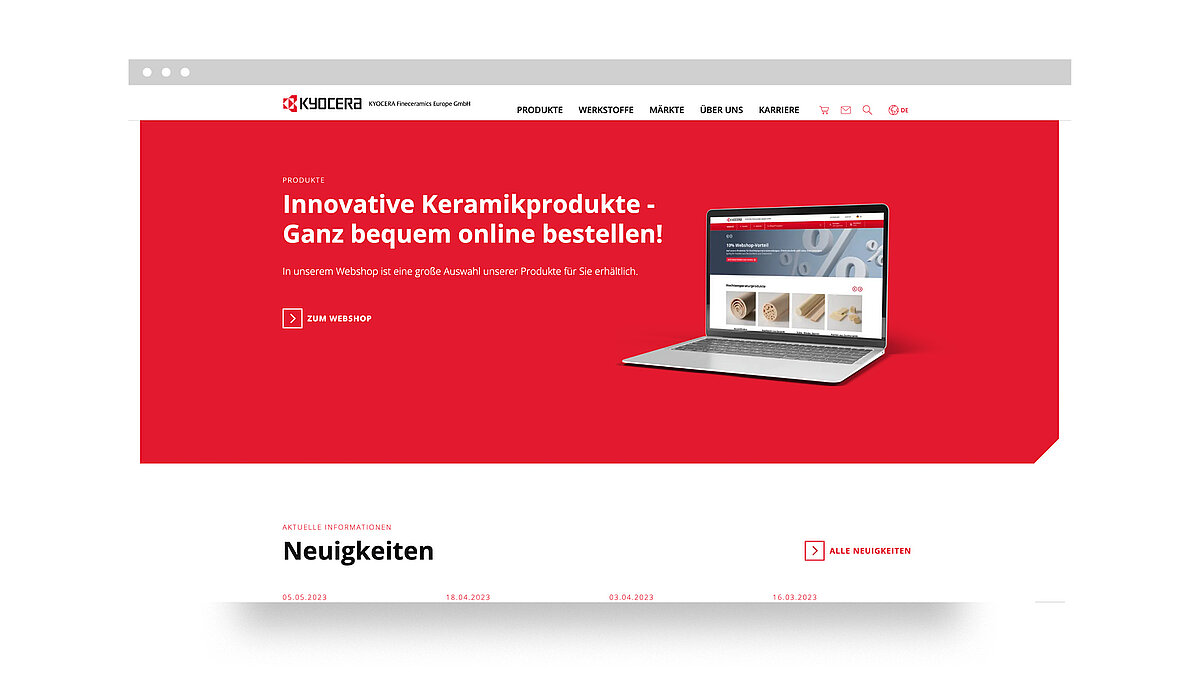 Um die Außenkommunikation zu stärken wurde zudem ein News- und Eventsystem in die Seite integriert. So können sich Besucher über die aktuellen Messetermine informieren oder mehr über die innovativen Lösungen von KYOCERA Fineceramics Europe GmbH erfahren.