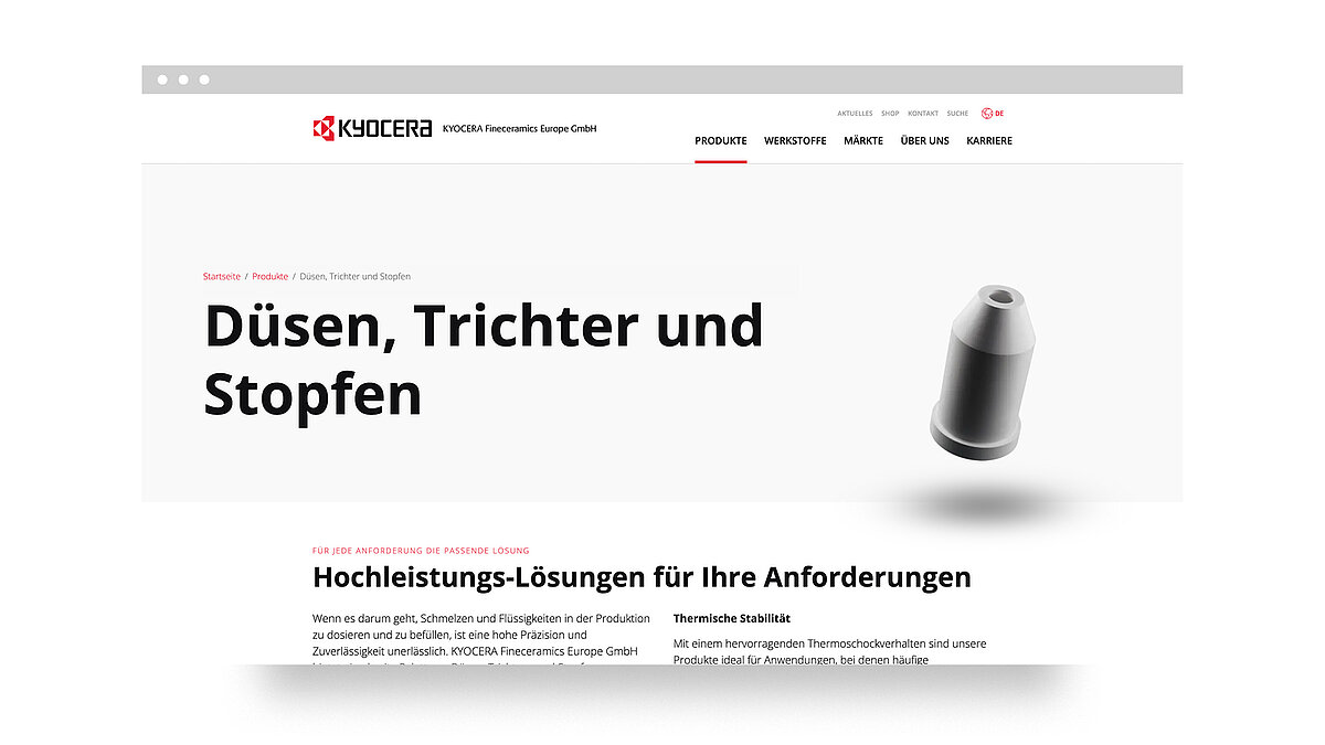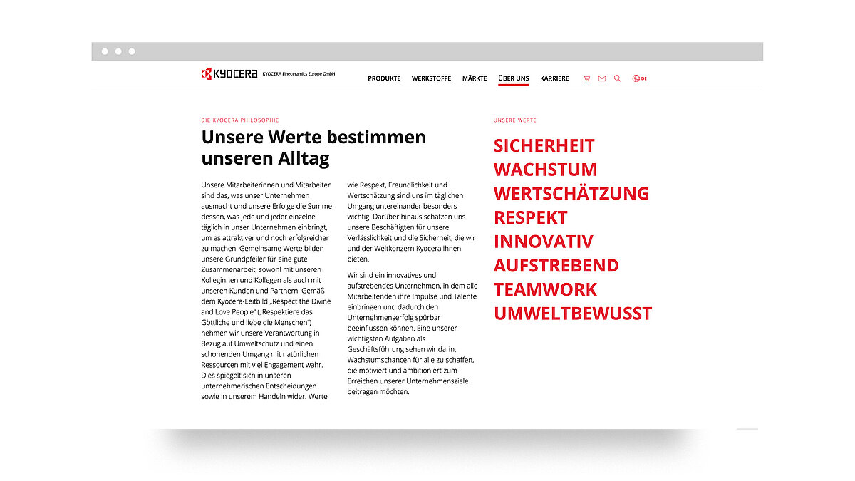 Am Ende entstand wie eingangs schon erwähnt eine Hochleistungswebsite, die sämtlichen Anforderungen von KYOCERA Fineceramics Europe GmbH gerecht wird. Im wöchentlichen Jour-Fix mit dem Kunden wurden Ergebnisse ausgetauscht und neue To-Dos definiert. Gerade bei solchen Großprojekten ist der enge und vertrauensvolle Austausch mit dem Kunden ausschlaggebend für den späteren Erfolg.