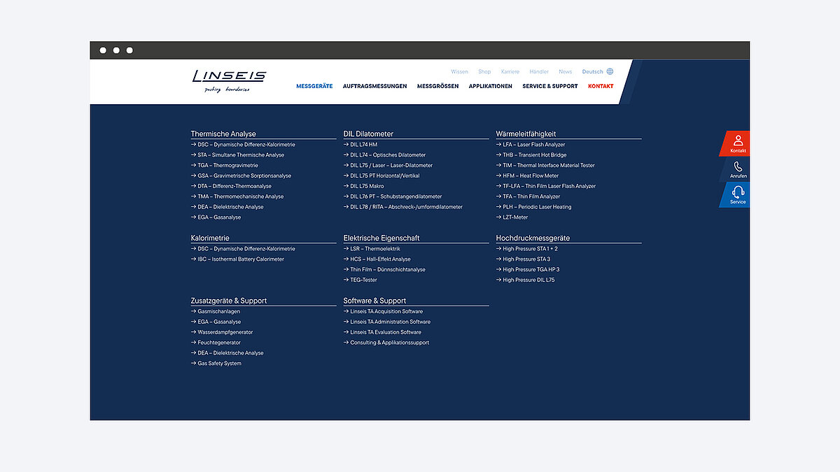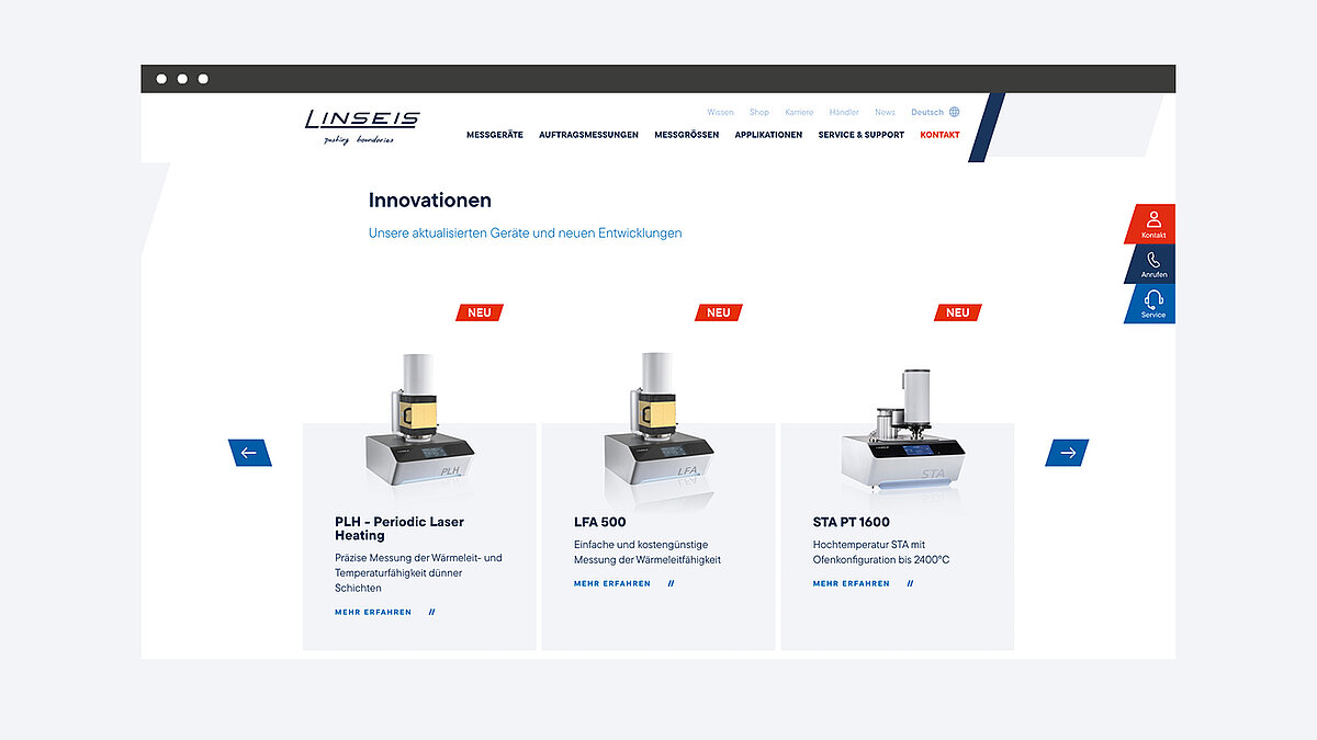 Mit dem Relaunch präsentiert sich LINSEIS im neuen Corporate Design und dadurch moderner, übersichtlicher und nutzerfreundlicher denn je. Besucher profitieren von einer klaren Navigation, verbesserten Funktionen und spannenden Einblicken in unsere Produktwelt rund um Thermoanalyse und Materialcharakterisierung. Egal ob am Desktop oder mobil – alle Informationen sind jetzt noch schneller und intuitiver erreichbar. Ganz nach dem Motto "pushing boundaries".